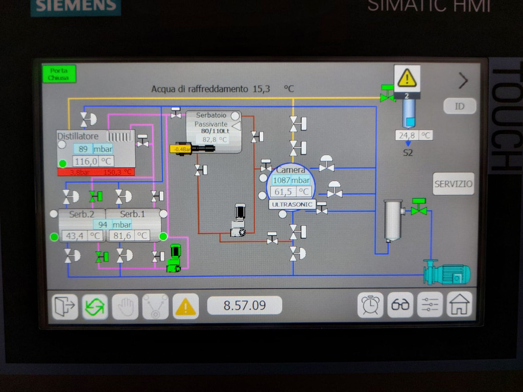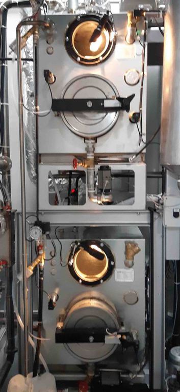 Toda la calderería (depósitos, destilador, cámara de lavado, tubería, etc...), así como los principales componentes (bombas, filtros, válvulas, etc...) de la máquina están construidos en acero inox.